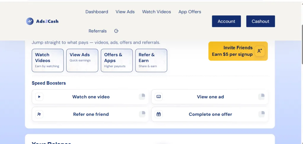 Ads2Cash’s referral system is aggressive: Earn $5 per signup (friend gets $5 too), plus 10% of their withdrawals. Share links like ads2cash.com/6xxbv via dashboard “Copy Link.” “Invite Friends to Earn More”: They join, start earning—you cash in passively.