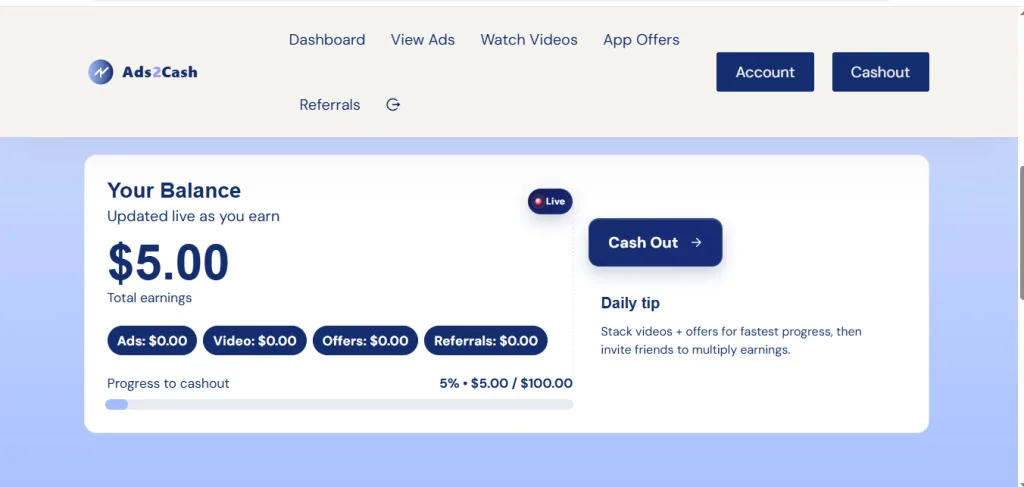 - Daily Tips: “Stack videos + offers for fastest progress, then invite friends to multiply earnings.” Progress bar shows 5% ($5/$100) to first cashout.
