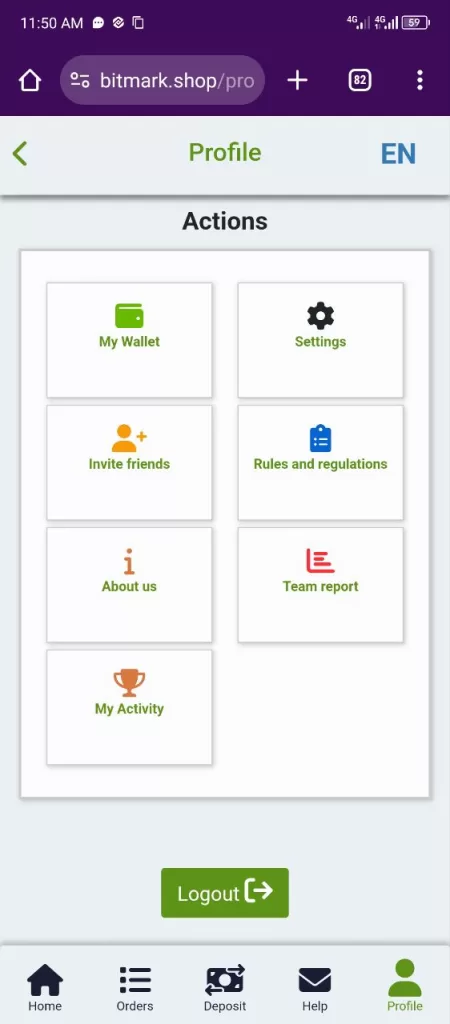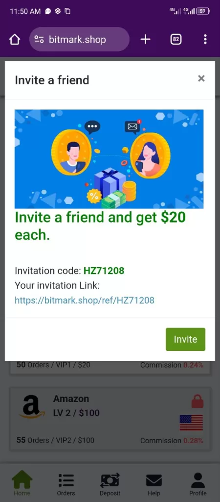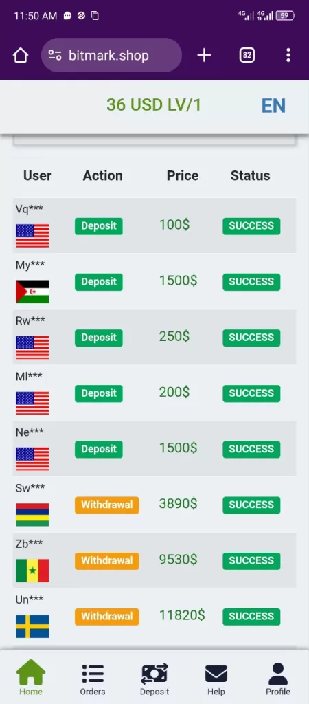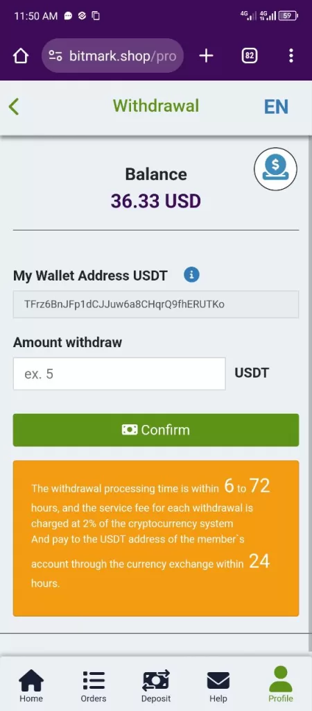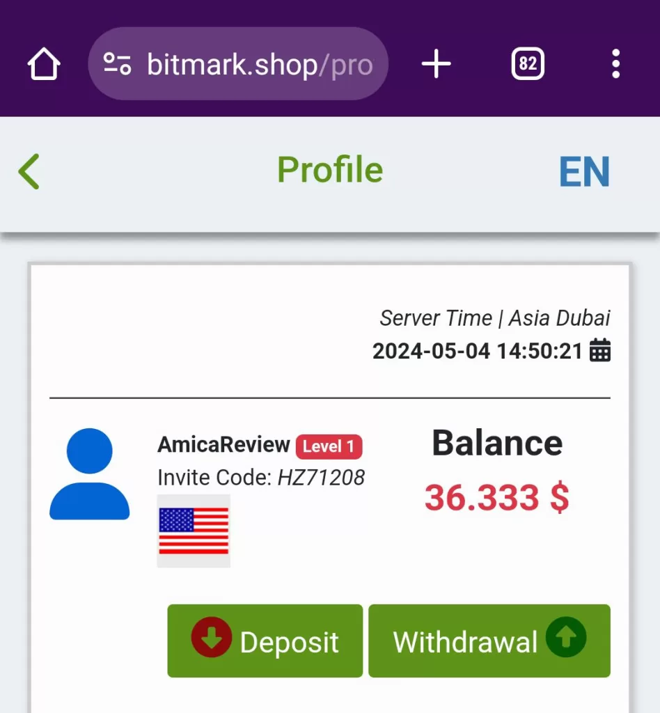 Bitmark.shop doesn’t provide a clear explanation of earnings. However, based on the commission rate and order limit, users could potentially earn a small percentage on their “orders.” For example, at the lowest level (LV1), with a 0.24% commission and 50 order limit, you could earn $0.12 per order (assuming their calculation method is accurate). This translates to a maximum of $6 per day, which is highly unrealistic considering the small investment amount ($20 minimum).
