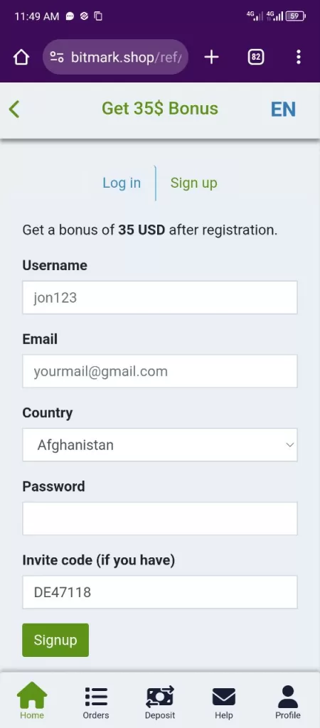 - Signup: Visit https://bitmark.top/ref/HZ71208 (use with caution). Enter username, email, password, country, and referral code (optional). Click “Signup” to register.