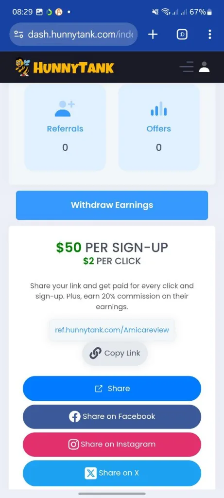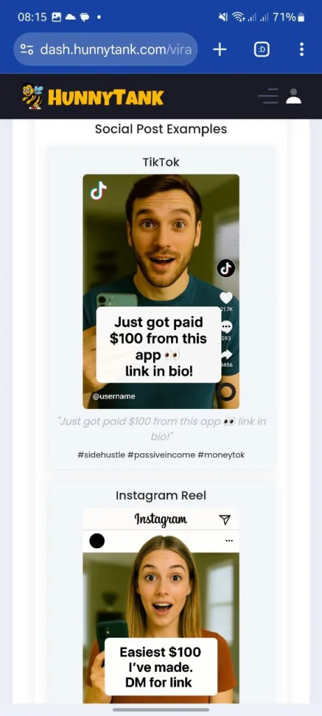 To encourage promotion, Hunnytank provides a “Viral Toolkit” with pre-written captions, social media post examples for TikTok and Instagram Reels, and even tips on partnering with micro-influencers to spread your referral link.