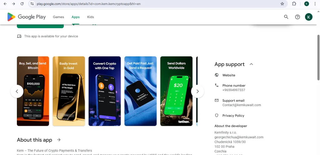 - Developer: Kem App (backed by Kemfinity s.r.o.).
