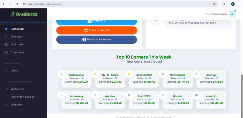 5. Viral Toolkit: This is cool for promoters – it gives tips on going viral, like posting on TikTok (record a 30-second video about rambucks and add your link to your bio), creating Facebook “click trains” (groups where people click each other’s links), Instagram Reels with hashtags like #sidehustle or #moneytok, and even partnering with micro-influencers. They provide caption ideas like “Just made $100 from my phone. Real money. Real fast. Use my link 👉 ref.rambucks.com/YourLink.” I used one of these and got a few more clicks.