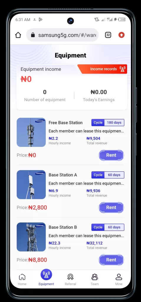 3. High Investment Returns: The promised returns on investments offered by Samsung5G.com are exceptionally high. For example, they claim to provide hourly incomes ranging from ₦2.2 to ₦2,122, depending on the investment package. Such high returns are often a hallmark of Ponzi schemes or investment scams designed to lure unsuspecting investors.