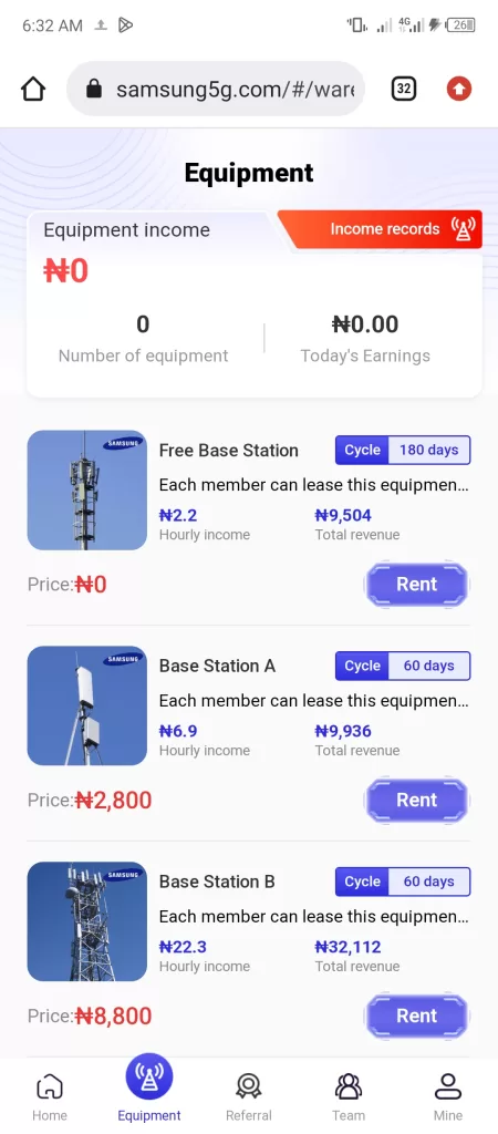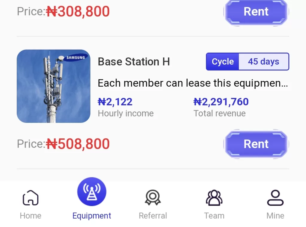 - Free Base Station: Offers a 180-day cycle with an hourly income of ₦2.2.