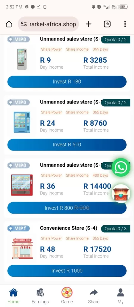 Supermarket-Investment boasts various investment plans, each named after a type of store (unmanned sales store, convenience store, etc.). These plans offer incredibly high daily returns, ranging from 9 Rand to a staggering 6720 Rand per day. The platform claims these returns come from the success of their parent company, CFAO Group, which supposedly operates supermarkets across Africa.