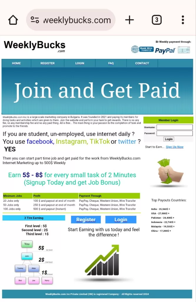 Launched in June 2023, WeeklyBucks.com claims to be a marketing company offering rewards for completing tasks and referring users. They boast unrealistic earning potential and a referral program, mirroring similar schemes like ilovedollars and Payout Project.