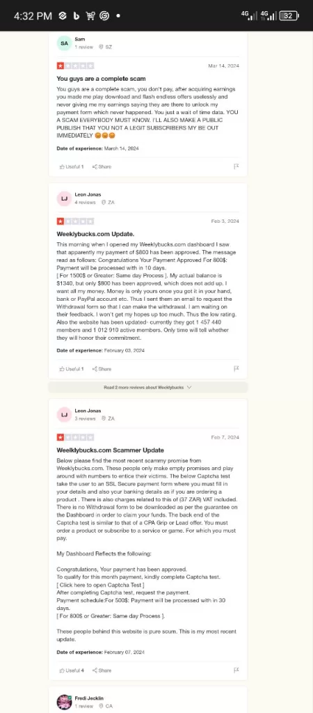 WeeklyBucks.com boasts positive earnings and a supportive community. However, user experiences on platforms like Trustpilot tell a different story. Here’s a glimpse into what real users have encountered:
