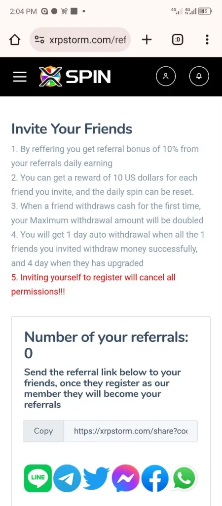 XRPStorm offers a referral program where users earn $10 for each friend they invite. Additionally, users receive a 10% bonus of their referrals’ daily earnings. Inviting friends also resets the user’s free spin count, potentially increasing daily earnings.