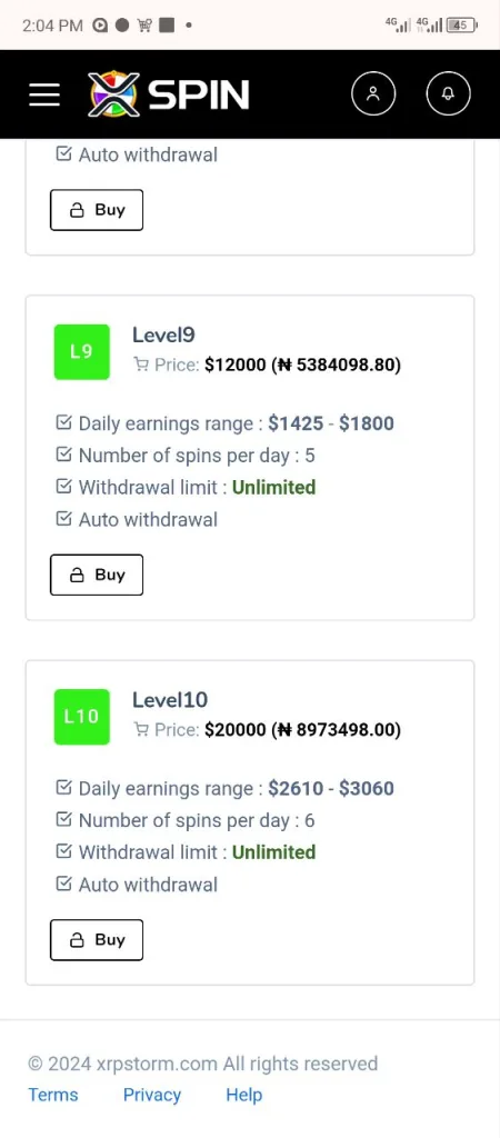 XRPStorm claims users can earn between $300 to $800 daily, depending on their account level. The earning mechanism revolves around spinning a digital wheel, where each spin can yield different amounts based on the user’s account rank. Here’s a breakdown of the earning potential at different levels: